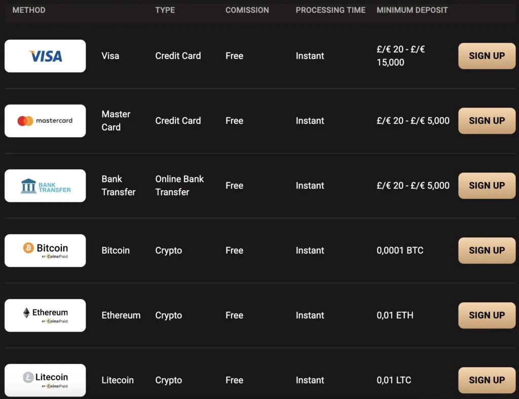 | Credit or Debit Cards (Visa, Mastercard) | E-wallets like Skrill and Neteller | Bank Transfers |